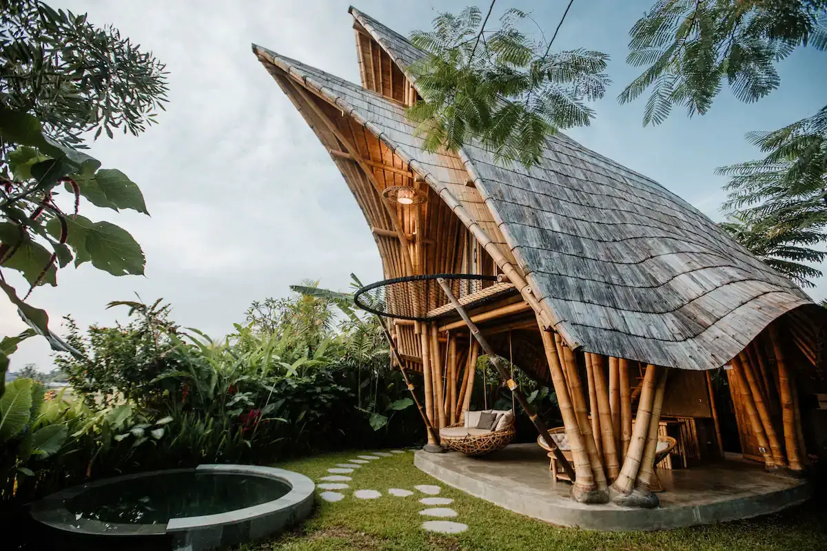 A mini villa made entirely of bamboo with its own small circular outdoor swiming pool just a few stone steps away from the patio. One of the top choices for couples wondering where to stay in Ubud.